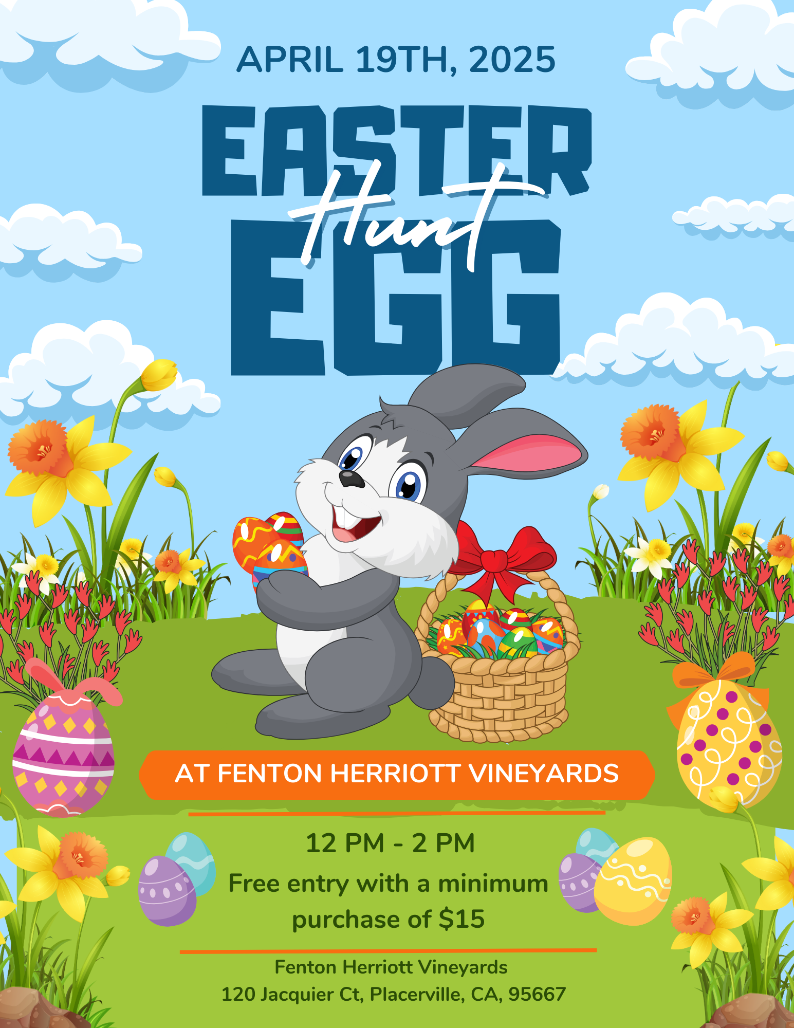 « All Events This event has passed. Easter Egg Hunt April 19 @ 12:00 pm - 2:00 pm « Red Blend Private Tasting Live Music Featuring Patrick Walsh » Join us for an Easter egg hunt! Free entry with a minimum purchase of $15. Add to calendar Google Calendar iCalendar Outlook 365 Outlook Live Details Date: April 19 Time: 12:00 pm - 2:00 pm Website: https://www.fentonherriott.com/ Venue Fenton Herriott 120 Jacquier Ct. Placerville, CA 95667 United States + Google Map