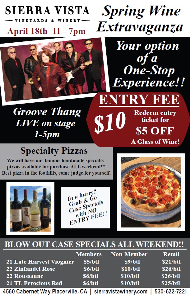 Sierra Vista Vineyards & Winery 4560 Cabernet Way, Placerville, CaliforniaCome join us to celebrate the start of Spring with our Annual Spring Wine Extravaganza! Groove Thang will be playing LIVE. We will have our specialty pizzas and wine by
