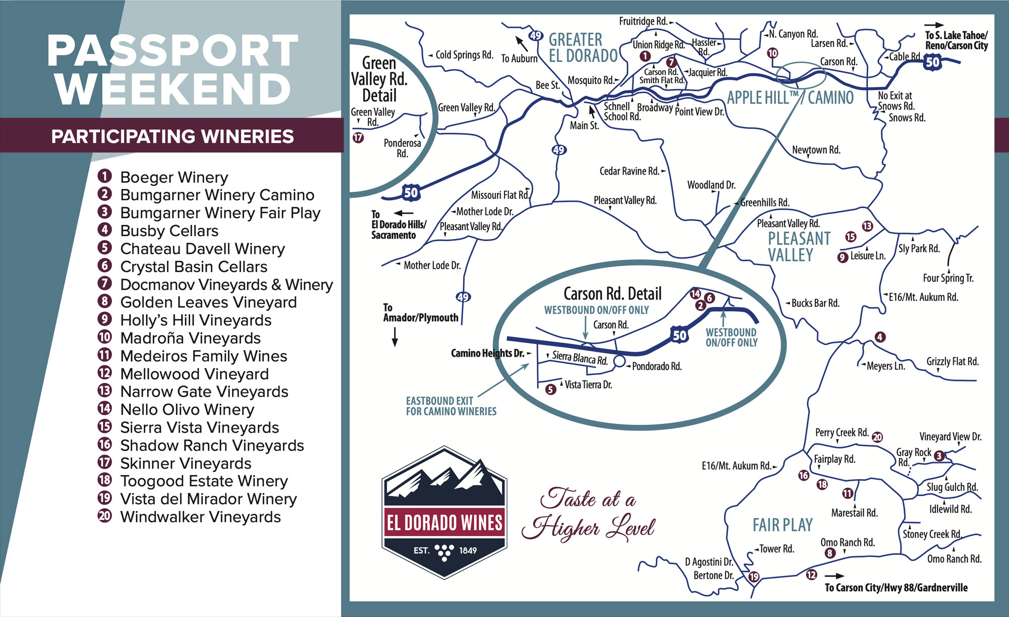 Today, El Dorado County has more than 2,000 acres of vines, is home to approximately 70 wineries, and produces some of California’s most sophisticated wines. Join us on an exciting journey to discover why El Dorado is one of California’s oldest wine regions and best-kept secrets, and where every winery and every sip tells a unique story.