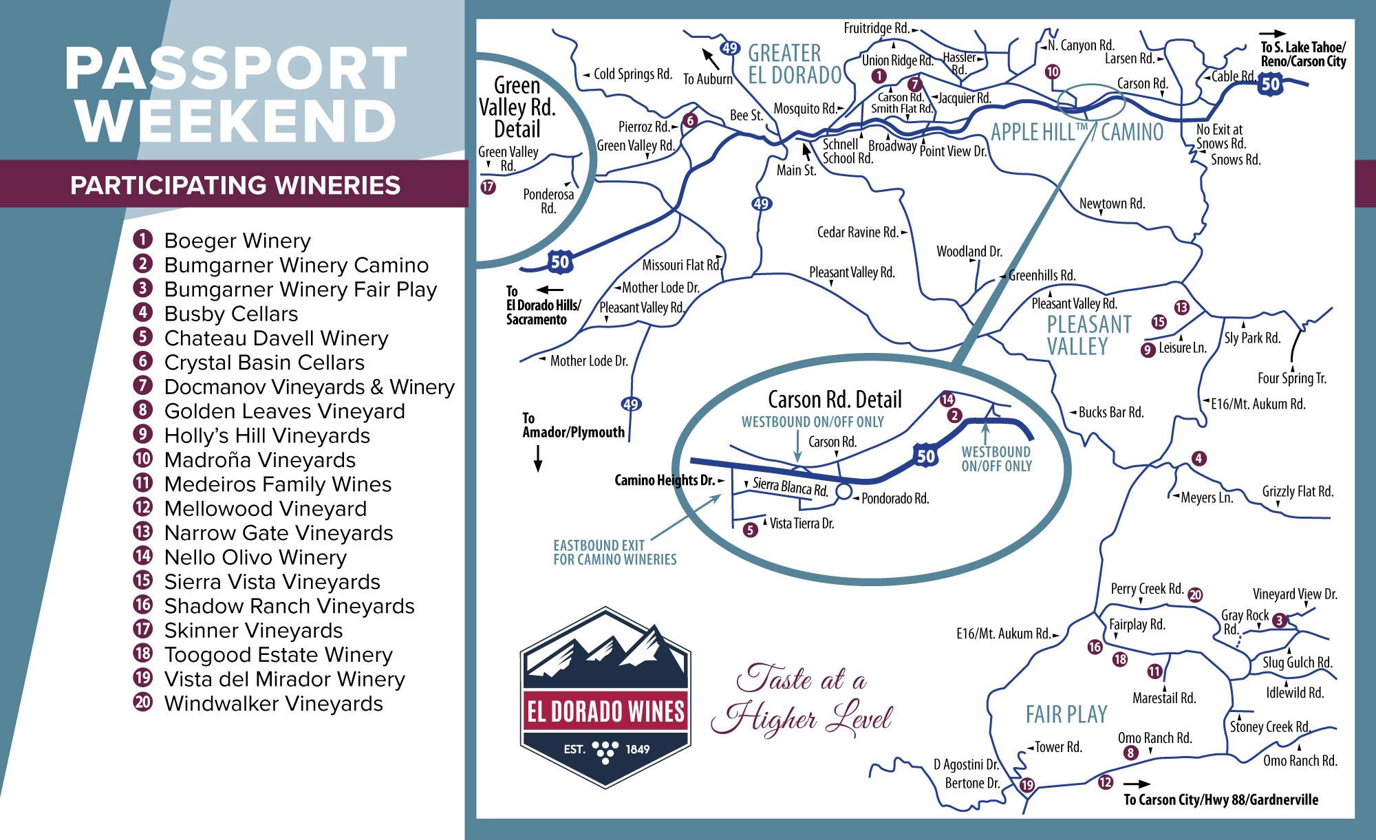 Today, El Dorado County has more than 2,000 acres of vines, is home to approximately 70 wineries, and produces some of California’s most sophisticated wines. Join us on an exciting journey to discover why El Dorado is one of California’s oldest wine regions and best-kept secrets, and where every winery and every sip tells a unique story.