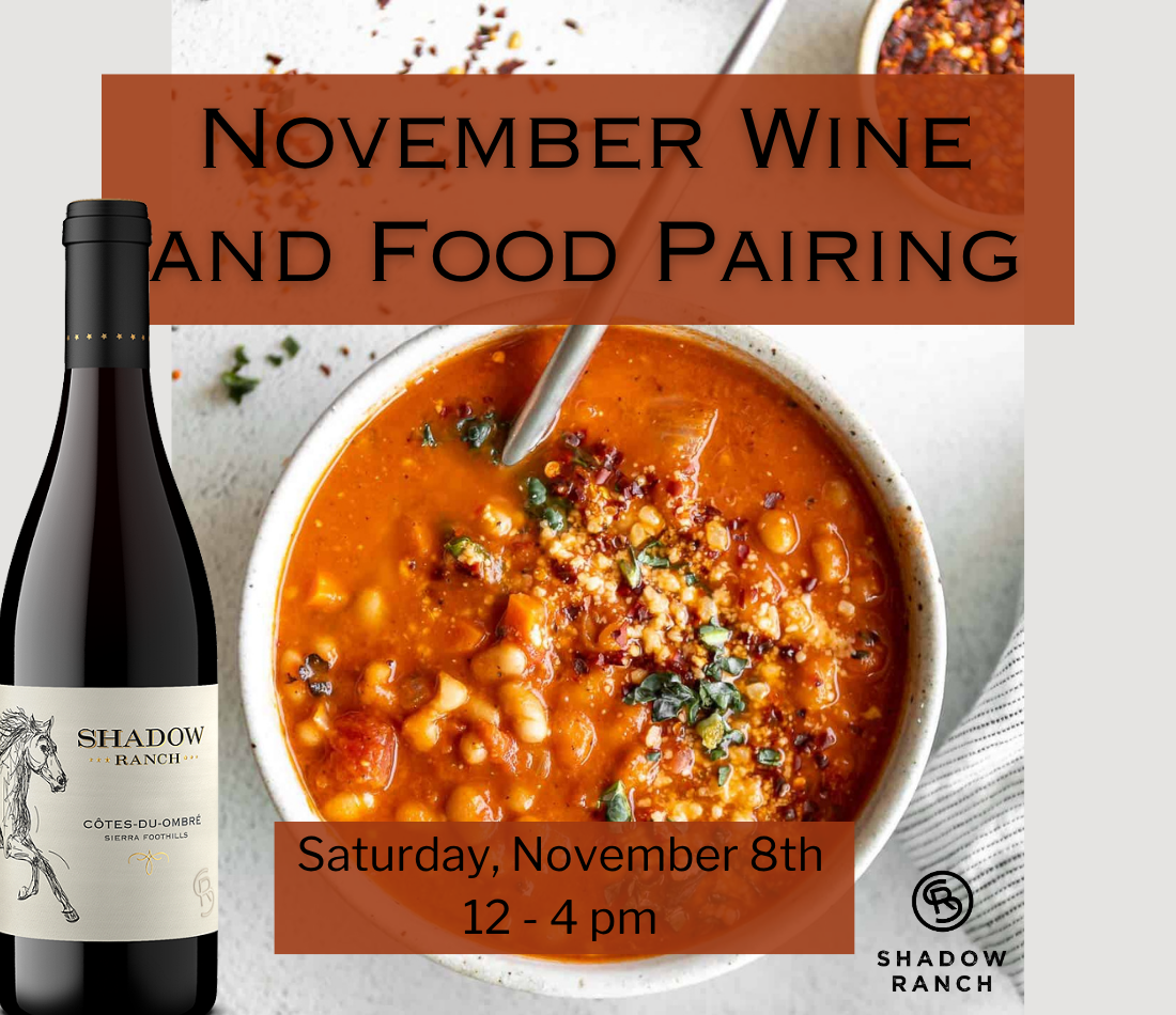 Shadow Ranch Vineyards 7050 Fair Play Road, Fair Play, CA, United StatesFor our November Wine and Food Pairing we’ll be pouring our 2022 Côtes Du Ombré alongside a warm and hearty soup! Reservations Required $10/person, $8/person for club members and their guests https://shadowranch.orderport.net/reservations/11808/Shadow-Ranch/booking