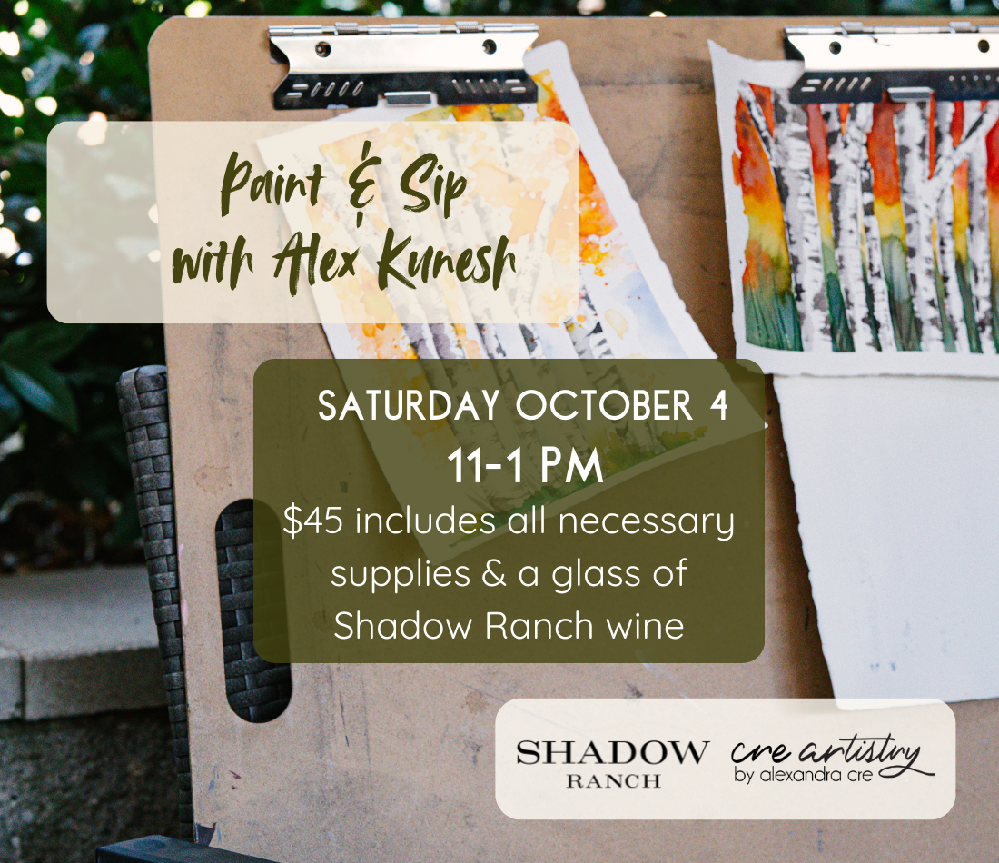 Shadow Ranch Vineyards 7050 Fair Play Road, Fair Play, CA, United StatesSip on a glass of wine and enjoy a few hours of creativity! Local artist Alex Kunesh will walk you through the creation of a fall-inspired watercolor painting that you can take home! Tickets are $45/person ($36 for club members) and include all necessary art supplies as well as a glass of Shadow Ranch wine.